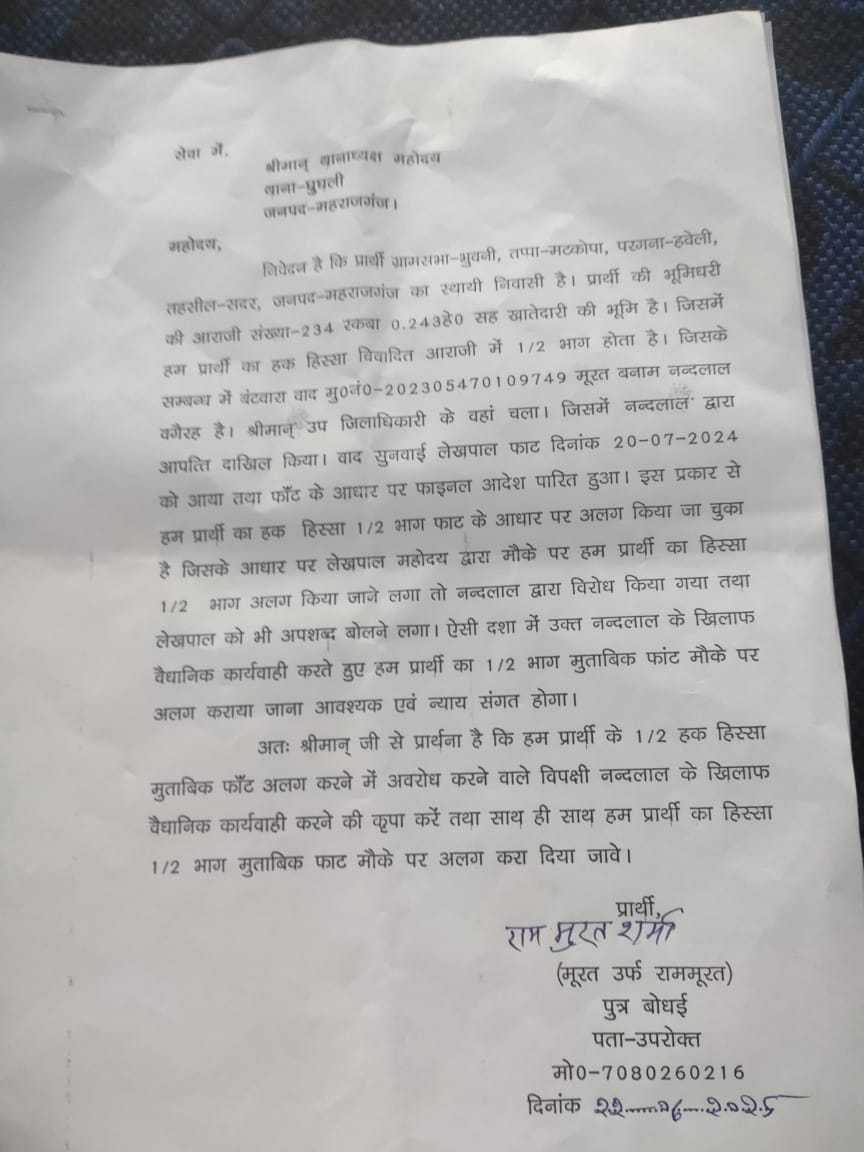 महराजगंज के भुवनी गांव में बंटवारे के बाद भी नन्दलाल द्वारा अवरोध, पीड़ित राममुरत ने प्रशासन से की न्याय की गुहार