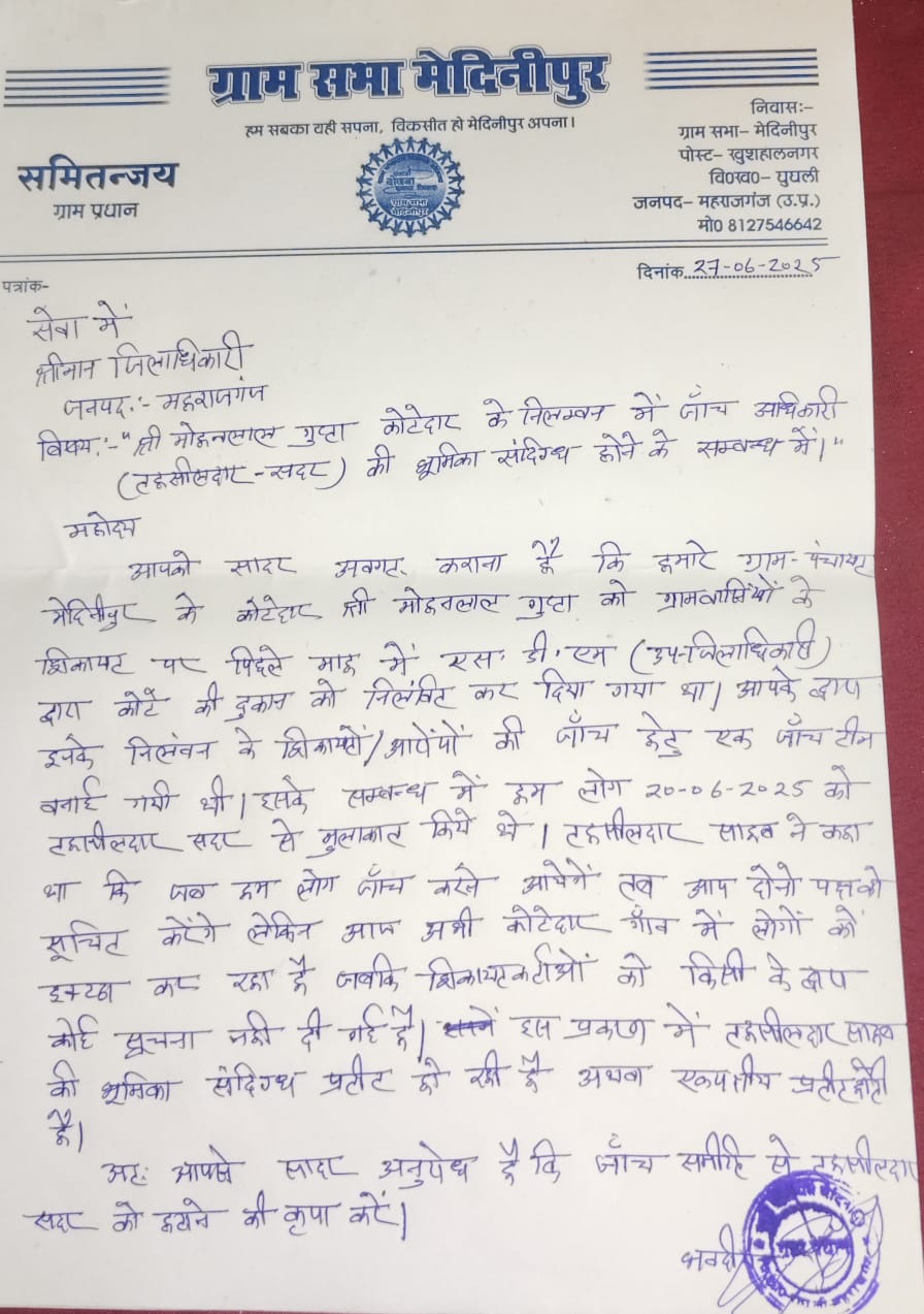 ग्रामसभा मेदिनीपुर के ग्रामीणों ने जिलाधिकारी से की निष्पक्ष जांच की मांग, कोटेदार पर पहले भी लग चुके हैं गंभीर भ्रष्टाचार के आरोप