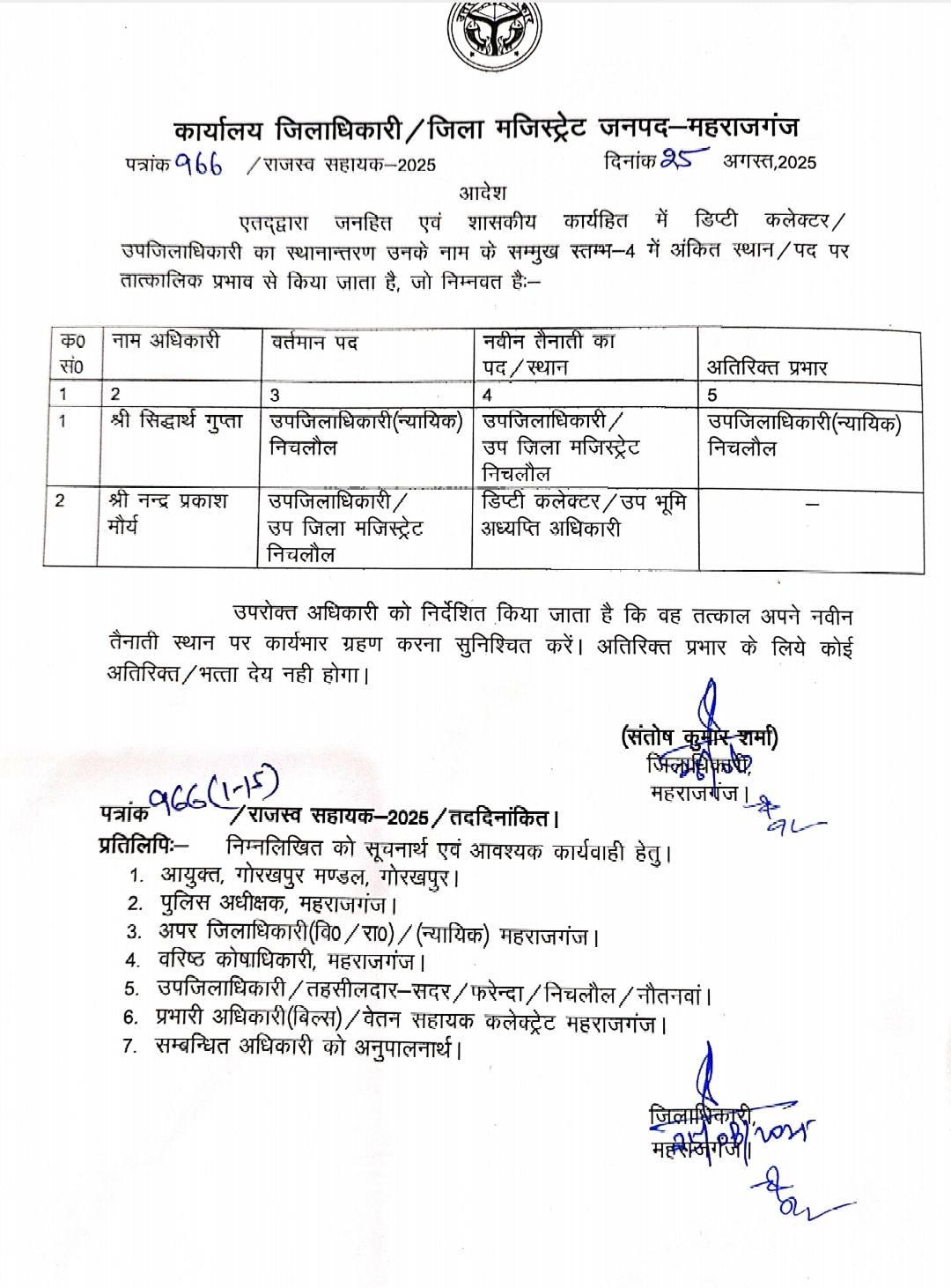 इन्हीं विवादों के बीच सोमवार को जिलाधिकारी महराजगंज ने आदेश जारी कर नंदकिशोर मौर्य का तत्काल प्रभाव से स्थानांतरण कर दिया। आदेश पत्रांक 966/राजस्व सहायक-2025 के अनुसार अब निचलौल तहसील का कार्यभार उपजिलाधिकारी सिद्धार्थ गुप्ता को सौंपा गया है। वहीं, नंदकिशोर मौर्य को डिप्टी कलेक्टर/उप भूमि अध्याप्ति अधिकारी के पद पर भेजा गया है।