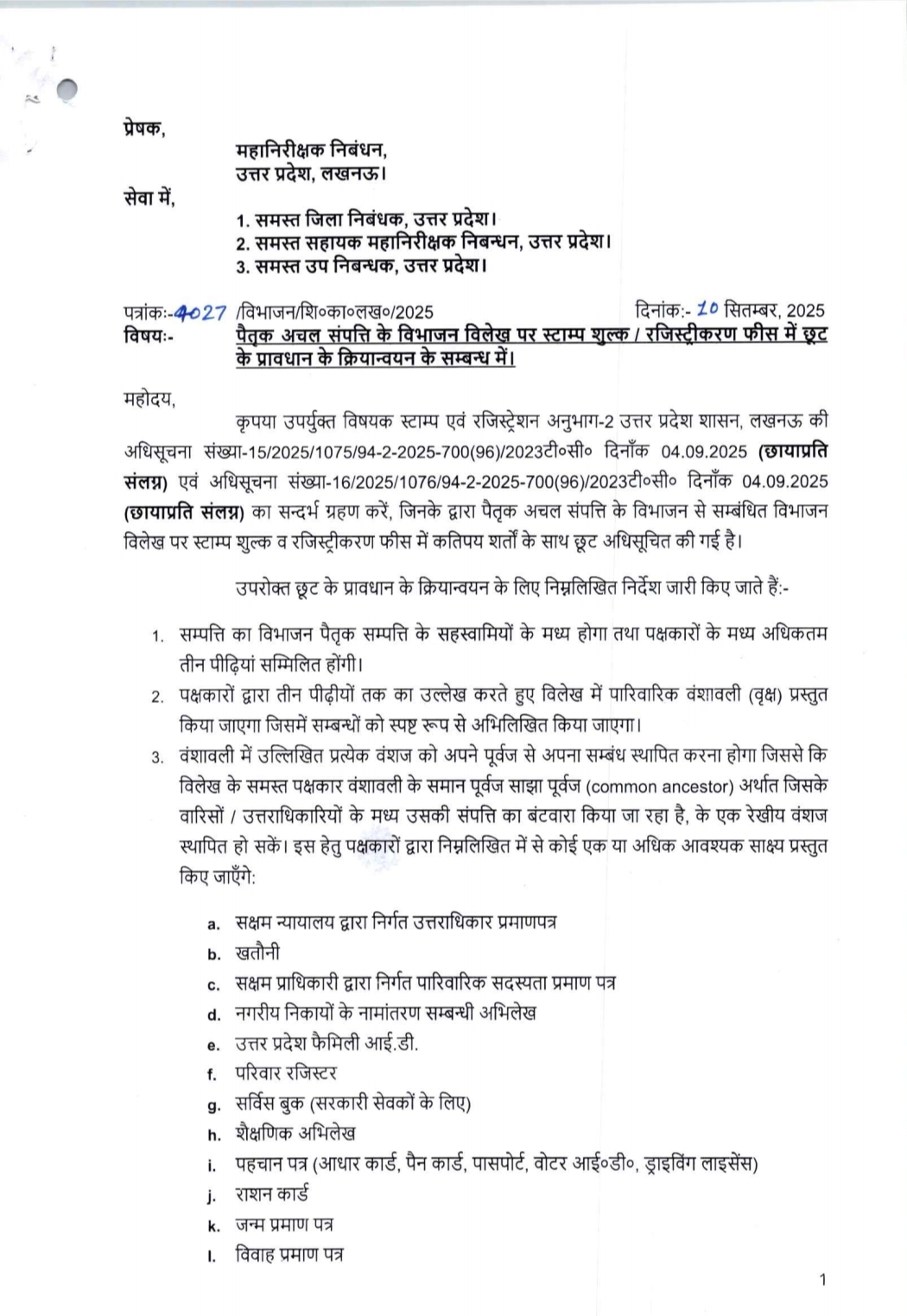 लखनऊ। उत्तर प्रदेश शासन ने पैतृक अचल संपत्ति के विभाजन विलेख पर स्टाम्प शुल्क और रजिस्ट्रीकरण फीस में छूट को लेकर महत्वपूर्ण आदेश जारी किया है। महानिरीक्षक निबंधन, उत्तर प्रदेश, लखनऊ की ओर से 10 सितम्बर 2025 को जारी पत्र के अनुसार यह छूट कुछ शर्तों के साथ लागू की जाएगी। इस निर्णय से उन परिवारों को राहत मिलेगी, जो पैतृक संपत्ति के बंटवारे को लेकर लंबे समय से रजिस्ट्रीकरण शुल्क और स्टाम्प शुल्क की भारी भरकम लागत से परेशान थे।
